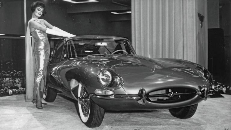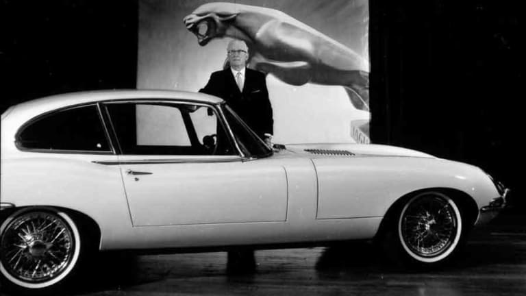 La Jaguar Type E à sa présentation, à Genève en 1961 (en haut). William Lyons et la Type E (en bas)