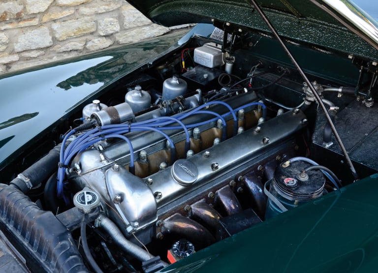 Si l’on consulte la cote LVA 2026, l’on constate vite que la XK 150 est à la fois la plus abordable (si l’on choisit le coupé 3.4) et la plus onéreuse de toute la lignée (si l’on jette son dévolu sur le roadster 3.8 S). L’écart assez considérable entre ces deux extrêmes (60 000 euros pour l’une, près de 200 000 euros pour l’autre) illustre assez bien les tiraillements que provoque le modèle chez les collectionneurs et les bons connaisseurs de la marque. D’un côté, l’auto présente toutes les typicités d’une fin de race : second restylage d’une série déjà cruellement datée, engendrant une modernisation esthétique faisant encore débat près de soixante-dix ans après sa sortie ; mais aussi aboutissement technique, avec l’adoption de freins à disques alors rarissimes sur une voiture de route et du fameux moteur XK dans son itération la plus puissante – les 265 chevaux du 3,8 litres nanti de la culasse dite straight port ont alors à la fois fait couler beaucoup d’encre et saliver plus d’un amateur. Chef-d’œuvre du motoriste Harry Weslake, le moteur qui allait accompagner les premiers millésimes de la Type E encore à naître avait, il est vrai, trouvé là l’écrin idéal pour faire ses preuves…