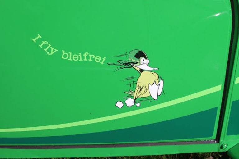 Une 2CV rapide ! Basée sur une 2CV 6 aux spécificités germaniques, cette série spéciale se distingue juste par ses autocollants qui reprennent le thème du Canard Vert ; cette fois, elle revendique fièrement la sportivité légendaire de la 2CV avec un canard cas