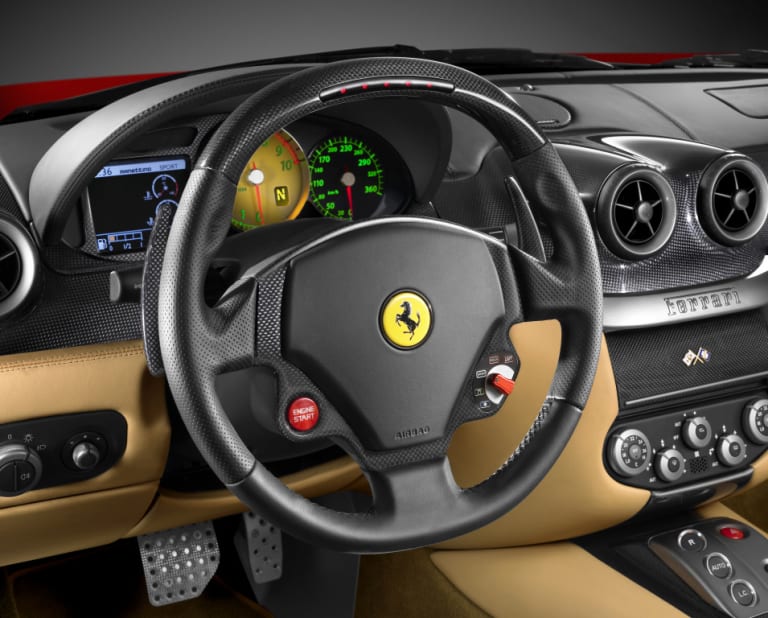 Dernière de sa lignée à pouvoir disposer d’une boîte manuelle, la 599 n’a pour autant trouvé que très peu de clients suffisamment attachés aux traditions pour se montrer sensibles à cet émouvant reliquat — seules 30 voitures quittèrent l’usine ainsi gréées, ce qui en fait probablement les exemplaires les plus désirables de cette série. L’honnêteté commande cependant de reconnaître que, du point de vue de l’efficacité pure, la boîte F1 maison, rebaptisée Superfast pour l’occasion, ne laissait aucune chance à son homologue manuelle, avec des temps de passage de référence pour l’époque et encore convaincants de nos jours. De ce point de vue, avec son Manettino greffé sur le volant, sa suspension magnéto-rhéologique et les raffinements aérodynamiques de sa carrosserie, la 599 est captivante dans ses détails car elle annonçait, sans trop en faire, à quoi allaient ressembler les Ferrari du nouveau siècle.