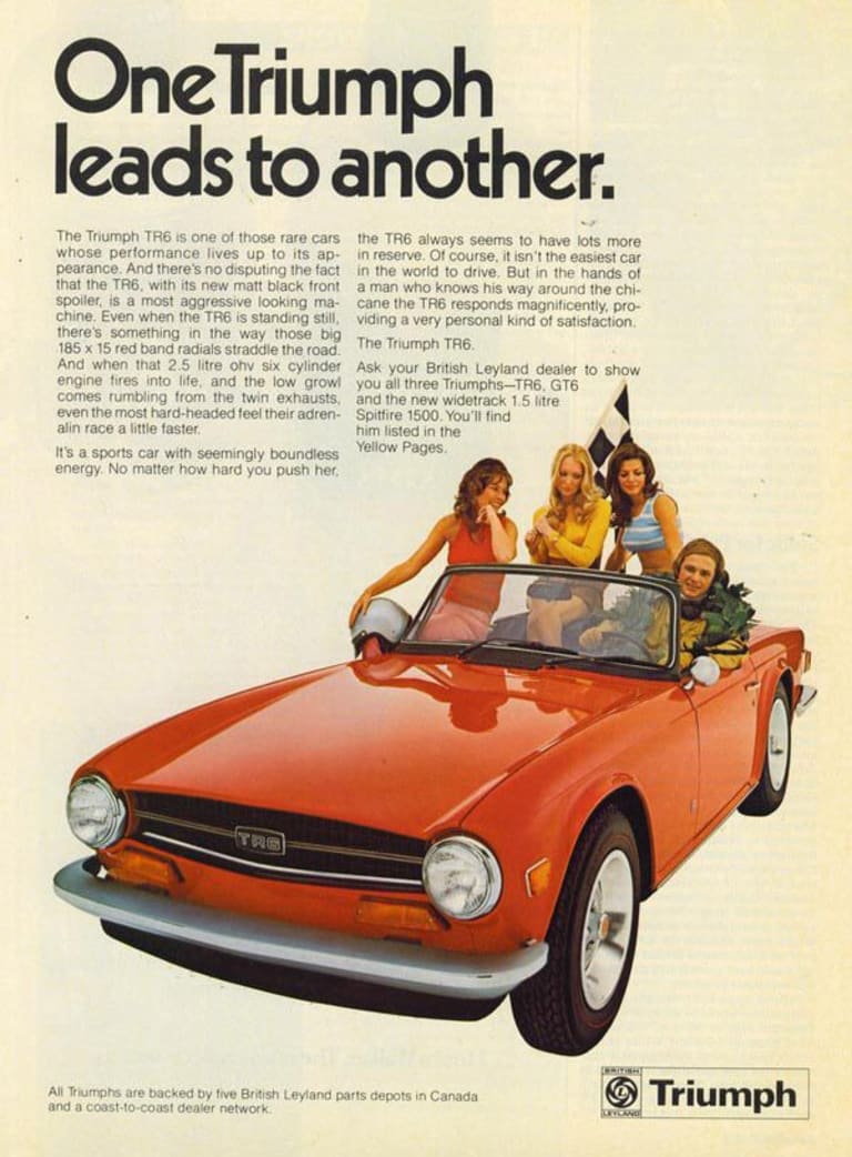 Quelle a été la dernière véritable Triumph ? La TR7 ? La TR8 ? L’Acclaim ? (Non, je rigole). À la vérité, pour bon nombre d’amateurs, c’est la TR6, et elle seule, qui mérite ce titre. Cela peut bien sûr se discuter mais il est vrai que l’auto ressemble beaucoup à la conclusion d’une très belle histoire, aux derniers feux d’une aventure saccagée par l’incompétence, la médiocrité et l’absence de vision des dirigeants de la British Leyland. Déjà esthétiquement abâtardie aux yeux de certains amateurs, la TR6, avec sa carrosserie hétéroclite, son straight six rustique et son concept immuable, exhalait de lourds remugles de fin de race. C’était plus qu’une voiture, c’était un avertissement sans frais (ou presque) : lorsque sa fabrication s’arrêta, rien ne fut jamais plus comme avant…