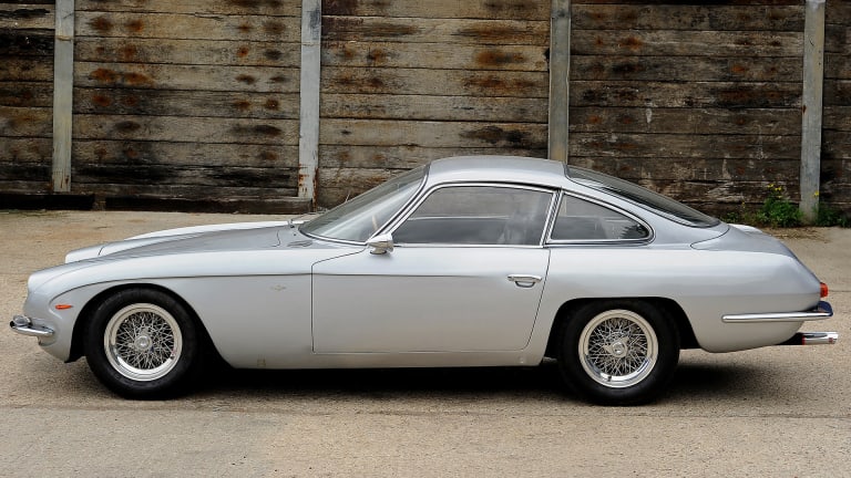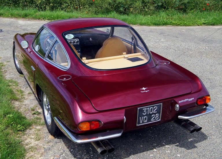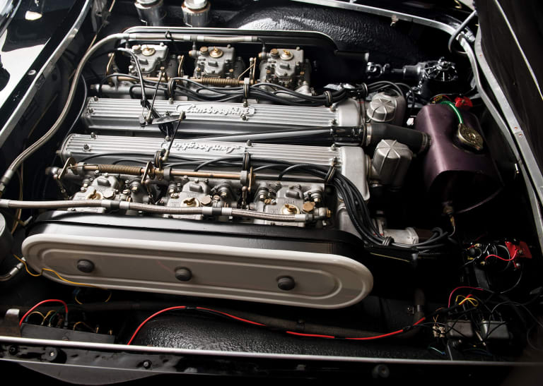 Bien sûr, nous en sommes encore loin lorsque le prototype de la 350 GTV est dévoilé en grande pompe lors du Salon de Turin 1963. Dessiné par Franco Scaglione, l’engin s’avère aussi prometteur qu’inabouti – ou réciproquement, selon les points de vue. Le coup d’essai n’est certes pas un coup de maître, mais les caractéristiques générales de l’auto témoignent du sérieux de ses concepteurs, qui ont donc choisi la coûteuse mise en chantier d’un moteur spécifique au lieu de céder à la facilité en allant, comme Iso ou Facel Véga, se fournir aux États-Unis, inlassables pourvoyeurs de mécaniques puissantes, peu onéreuses mais d’une rusticité très éloignée des ambitions de Ferruccio Lamborghini en la matière. De fait, le douze-cylindres Bizzarrini, revu et corrigé par Giampaolo Dallara – qui créera sa propre officine une dizaine d’années plus tard – présente une fiche technique qui, à certains égards, semble élaborée afin de narguer Ferrari. Car le V12 de Sant’Agata Bolognese, dont la cylindrée de 3464 cm3 a dicté l’appellation de la voiture, dispose d’une distribution à quatre arbres à cames en tête, raffinement alors interdit à la 275 GTB ! Les 280 ch qu’il revendique situent la 350 GT de production (le « V » a disparu en route mais, comme on s’en doute, l’auto n’en demeure pas moins veloce) au niveau des meilleures. Outre la Ferrari précitée, la Lamborghini s’en va ainsi se mesurer aux Maserati Mistral, Aston Martin DB4 ou Jaguar Type E – autrement dit, le gratin des GT de l’époque.