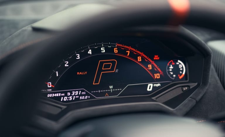 Dans les colonnes de Sport Auto, on a pu lire que la Sterrato était la Lancia Stratos des temps modernes. C’est assez bien vu : à un demi-siècle de distance, les similitudes entre les deux autos sont si singulières qu’elles ne peuvent que retenir l’attention du connaisseur – même si, contrairement à son aînée, la Lamborghini ne s’alignera jamais en compétition et ne risque donc pas d’égaler son palmarès (pour mémoire : trois titres de championne du monde des rallyes dans les années 1970). De fait, depuis la mythique Lancia, pensée avant tout pour la course, on n’a pas croisé beaucoup de voitures comparables, je veux dire une sportive biplace dotée d’un moteur central et pourtant capable de s’en aller crapahuter hors goudron. En dehors des modèles de course déclinés en versions routières pour des raisons d’homologation, les plus érudits (de même que les amateurs de bizarreries invendables) citeront sans doute la Mega Track, objet aussi fantasmatique que difficilement utilisable, ce qui n’est pas le cas de la Huracán ainsi gréée. Par un savoureux hasard – qui n’en est peut-être pas un –, la Sterrato a vu le jour la même année qu’une certaine Porsche 911 Dakar, laquelle peut, en l’espèce, revendiquer une antériorité et une légitimité historique dont la voiture italienne est dépourvue… À l’arrivée toutefois, les similitudes sont frappantes, au moins en termes de philosophie.