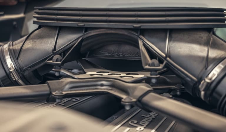 Vous l’aurez compris, je force quelque peu le trait et la Sterrato ne prétend en aucun cas pouvoir suivre un Toyota Land Cruiser dans le redoutable exercice du croisement de ponts. Compétente hors goudron jusqu’à un certain point – plus en tout cas que 90 % des SUV grand public qui saturent nos routes et seraient incapables de quitter le bitume sans dommages –, cette Lamborghini montée sur échasses (la garde au sol est augmentée de 44 mm par rapport à une Huracán classique) ne se cantonne pas à un simple exercice de style pour frimeurs. Pour autant, les responsables du projet, lors de la présentation de la Sterrato, prirent le soin d’insister sur le fait que l’engin se destinait plus à des randonnées en « tout chemin » plutôt qu’au franchissement pur et dur (mais sincèrement, qui en doutait ?). Quoi qu’il en soit, tout l’accastillage attendu pour ce genre de machine répond présent : élargisseurs d’ailes en plastique noir, pneumatiques spécifiques développés tout spécialement par Bridgestone, barres de toit (eh oui…), prise d’air supplémentaire au-dessus du moteur, sans oublier une paire de feux additionnels à LED qu’on croirait sortis de chez Norauto. Le résultat exsude des relents forcément contradictoires, en tout cas étranges, et il ne faudrait pas grand-chose pour imaginer que l’auto a subi les outrages d’un préparateur de seconde zone. Impression vite dissipée en examinant la voiture de plus près et en constatant, de la sorte, la qualité de la réalisation.