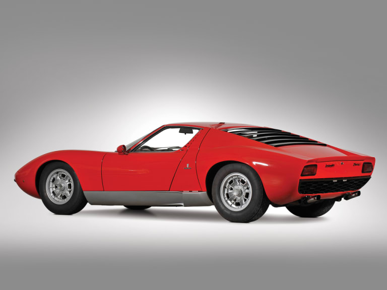 La Miura originelle, P400, fut produite à plus de 470 exemplaires. Devenue S en 1968 en 140 unités, elle finit en SV en 1971-1972 avec près de 150 exemplaires. Faire le compte des Miura n’est pas une sinécure en raison de l’incertitude des sources, la somme variant entre 762 et 765 véhicules construits incluant le spyder de 1968 et la Jota de 1970, détruite. Le châssis central monocoque est l’âme de la Miura, la carrosserie ne servant que d’enveloppe. Les berceaux, à l’avant et à l’arrière, en tôle ajourée, reçoivent les éléments de la motricité. La production commence en 1967, année au cours de laquelle 111 autos furent construites. Au Salon de Turin 1968, la Miura devient S avec une puissance portée à 370 ch (passages d’admission augmentés. 39,5 mkg à 5 500 tr/min contre 38,5 mkg à la première version), devient plus haute de 5 cm et, en 1971, non seulement Lamborghini apporte l’ultime évolution de la Miura, la SV atteignant 385 ch (40,7 mkg de couple à 5 750 tr/min), mais énonce l’après Miura en exposant l’étude LP 500 aboutissant à la LP 400 Countach de 1974.