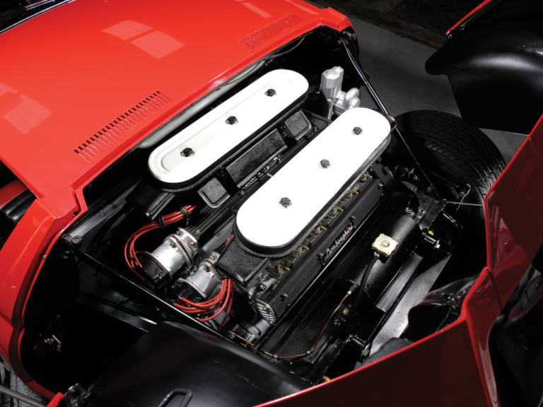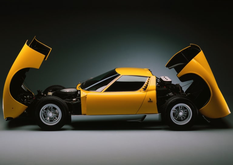 Cette structure si particulière commande tout le style de la Miura fixé par Marcello Gandini, après les premiers croquis de Giorgetto Giugiaro passé chez Ghia en 1965. La Miura est une œuvre collective d’hommes de la même génération, pas même trentenaires. Heureuse époque où l’on confiait de tels projets ambitieux à des hommes jeunes, à l’instar de Renzo Piano et de Richard Rogers et Gianfranco Franchini, lauréats du concours pour le Centre Pompidou en 1971. La maîtrise d’œuvre imputable à Gian Paolo Dallara, la constitution d’une telle équipe créative relève bien d’un Diaghilev de l’automobile, mais sûrement plus avisé homme d’affaires, l’industriel Ferruccio Lamborghini dont la légende veut l’installer adversaire d’Enzo Ferrari. Au passage, il est savoureux de lier le prénom du premier, Ferruccio, l’homme de fer, au patronyme du second, Ferrari, le forgeron. Un moteur (Bizzarini), un châssis (Dallara et Stanzani qui lui succéda aussi), un dessin (Gandini), un pilote (Wallace), voilà la poignée façonnant l’auto voulue par Lamborghini.