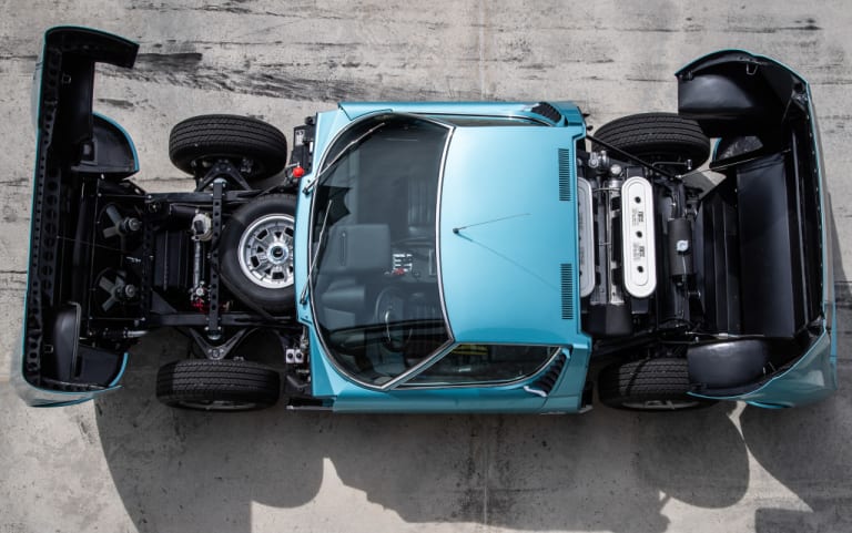 Aux jalousies du capot arrière répondent les entourages « en cils » des phares inclinables et les deux grilles de capot de part et d’autre du pli central. La grille droite articulée ouvre sur le bouchon de remplissage du réservoir placé à l’avant. Enfin, les uniques montants de portières sont faits de jours conduisant au capot moteur, à l’aplomb d’une écope sur le longeron, juste en avant de la roue arrière. De l’arrière, l’auto est aveugle, seule la vision panoramique est rapportée par le grand pare-brise galbé continué par les baies des portières. Le « regard » Miura semble dû à Giugiaro, reprenant cette solution du prototype Chevrolet Testudo de 1963, comme les entrées d’air des montants de portes, fixes sur celle-ci…