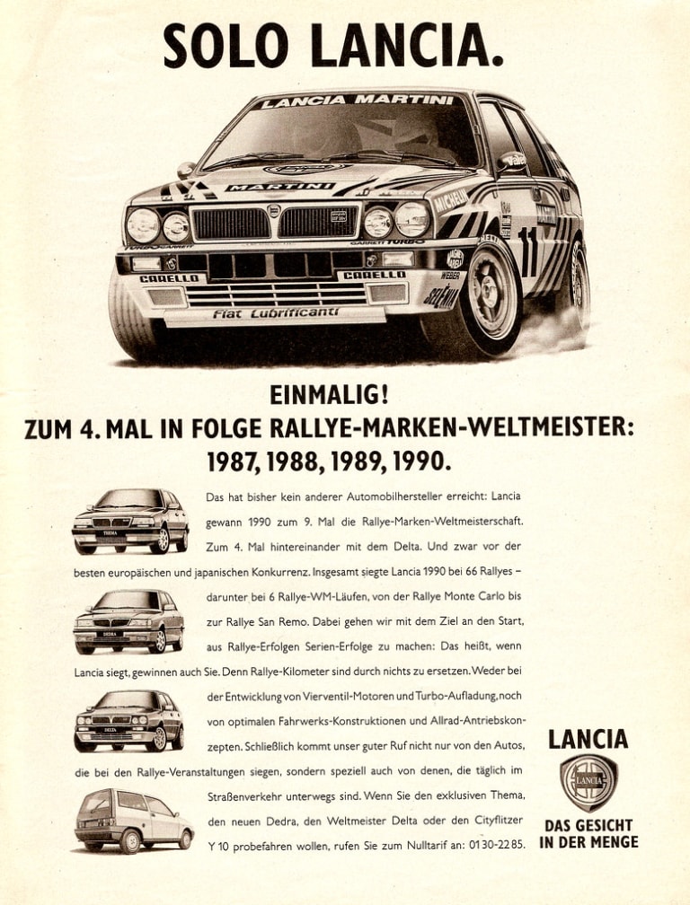 En Allemagne, Lancia mettait en avant ses victoires en rallye pour promouvoir sa gamme « sportive », dont la Dedra Integrale Turbo ie présente sous la Thema (équipée du même moteur).