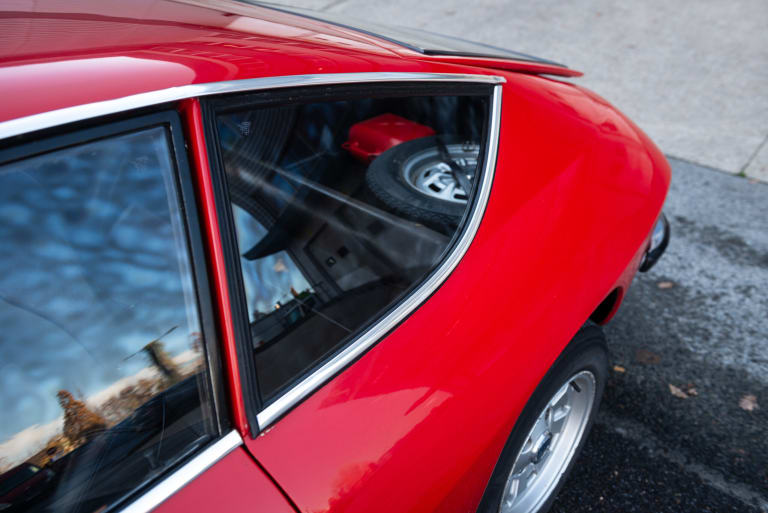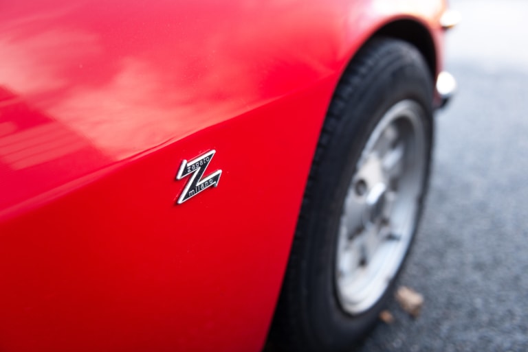 Cette Lancia Fulvia 1.3 S Sport Zagato séduit au premier regard par son allure unique et sa silhouette racée. Sa carrosserie rouge éclatante, dessinée pour allier élégance et performance, témoigne d’un soin constant. La peinture, bien tendue et brillante, met en valeur ses lignes fluides. Les jantes Cromodora, symboles de sportivité, complètent cette esthétique en bon état général. Les optiques de phares en verre et les rétroviseurs chromés apportent une finition raffinée, soulignant son caractère sportif et élégant.