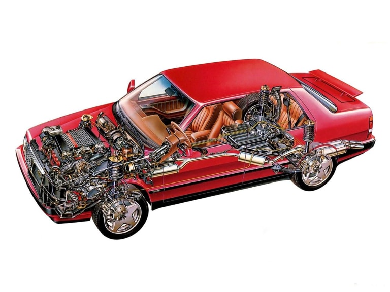 Puisant sans vergogne dans la banque d’organes de Fiat Auto, la Thema, à l’inverse de sa devancière, proposa dès l’abord une gamme très étendue de motorisations, allant d’un modeste 1,6 litre réservé au marché italien à l’inusable 2 litres que le groupe transalpin aura décidément servi à toutes les sauces, disponible ici avec ou sans turbo, auxquels s’ajoutèrent l’inévitable Diesel développé par SOFIM et même, histoire de proposer un six-cylindres, notre bon vieux V6 PRV ! De quoi couvrir l’essentiel des attentes et des besoins d’une clientèle de conquête (la malheureuse Gamma ne s’étant écoulée qu’à une quinzaine de milliers d’exemplaires), provenant tout aussi bien des propriétaires de Renault ou de Ford que de BMW ou de Mercedes, et, surtout, se vendre correctement à l’exportation. Pourtant, à ses débuts il manque à la Thema une motorisation de pointe, une version noblement motorisée et porteuse d’image, susceptible d’asseoir plus solidement encore la crédibilité de Lancia dans le haut de gamme. Comme au bon vieux temps de la Stratos, la synergie de groupe va jouer et aboutir à la création d’une machine à l’improbable pedigree, puisque c’est encore une fois vers Ferrari que Lancia se tourne alors pour ennoblir sa berline !