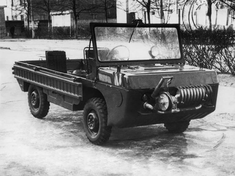 Tout commence avec la guerre de Corée. Les militaires soviétiques se rendirent compte à cette occasion que leur lourd véhicule de liaison, le GAZ-69, était bien trop vulnérable : pas assez habile et en outre incompatible avec un usage aéroporté, car trop lourd. Dans ce contexte, il fut demandé à l’institut National d’Automobile d’étudier un petit véhicule tout-terrain, amphibie, et aérotransportable. Les ingénieurs planchèrent donc sur deux prototypes, le 049 puis le 049A, entre 1958 et 1959. Une fois le concept validé, la production fut confiée au constructeur ukrainien LuAZ (Usine Automobile de Lutsk), pour donner naissance en 1961 au LuAZ-967, petit 4×4 amphibie doté d’un V4 MeMZ de 887cc et 38 chevaux.