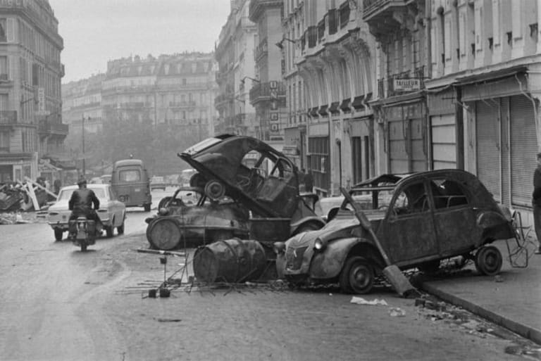Le voitures garées dans le quartier Latin payèrent un lourd tribut en mai 68 (images : France Bleu)