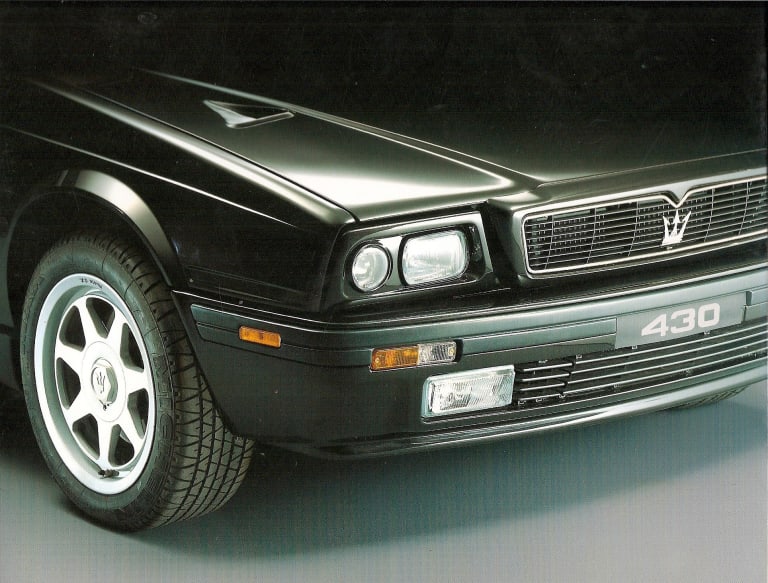 la face avant de la 430 « Gandini » : les optiques sont repris de la Shamal (comme sur la 4.24v) La même année sortait la 4.24v, produite jusqu’en 1991, et dotée du nouveau V6 à 4 soupapes par cylindres de 2 litres portée à 245 chevaux. Elle sera remplacée fin 91 par une deuxième série, bénéficiant elle aussi du restylage de Gandini. 874 exemplaires de ces deux versions (384 pour la première, 490 pour la seconde) seront produits jusqu’en 1993.