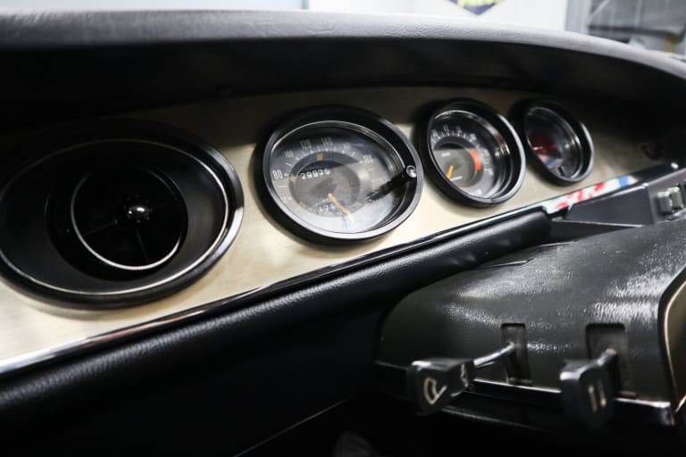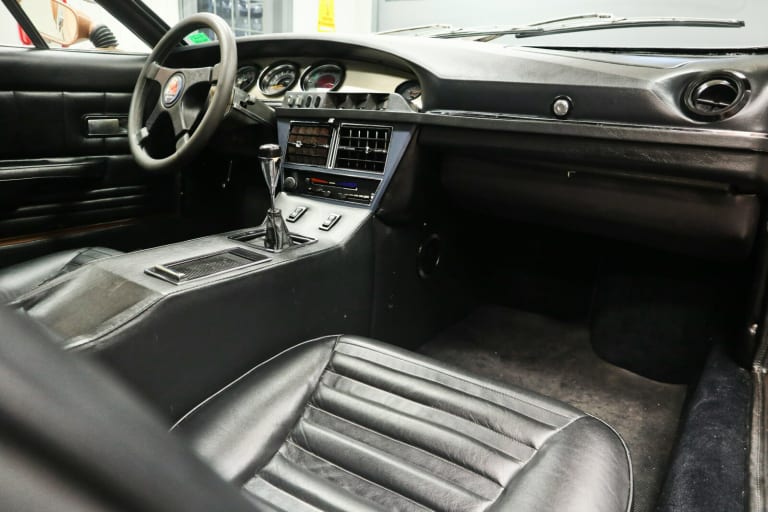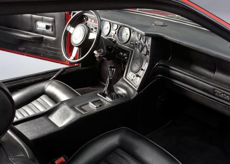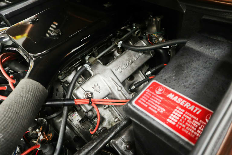 Quand on les compare de l’extérieur, les différences stylistiques entre la Merak et la Bora relèvent du détail et le béotien les confondra volontiers car, jusqu’au montant B, les deux autos sont à peu près identiques, au design de leurs jantes près. C’est vers l’arrière que la Merak exprime ses spécificités : aux généreux vitrages de la Bora, la six-cylindres préfère des dérives ajourées et un capot plat précédé d’une lunette verticale, qui n’est pas sans rappeler celle d’une 308 GTB. Toutefois, à cet égard la Maserati se montre moins gracieuse que la Ferrari ; aux galbes étudiés de la lucarne de sa rivale, la Merak oppose un pan coupé strictement rectiligne. Moins massive que la Bora lorsqu’on la contemple de trois-quarts arrière, sa sœur de gamme accroît encore le contraste esthétique déjà relevé sur son aînée — les rondeurs suggestives de la partie avant pouvant être considérées comme disharmonieuses vis-à-vis des angles vifs de l’arrière. En ouvrant la portière — l’auto conservera jusqu’au bout ses poignées de portes à palette d’origine Citroën —, on découvre une 2+2 dont l’aménagement variera sensiblement tout au long de la carrière du modèle. Après la cession de Maserati à Alejandro de Tomaso, en 1975, certains composants d’origine française furent progressivement abandonnés mais les premières Merak à conduite à gauche reçurent un mobilier de bord extrêmement proche de celui de la SM, avec laquelle la berlinette transalpine partageait aussi un V6 dont la fragilité a fait couler beaucoup d’encre depuis cinquante ans. Ici, il s’agissait de la version 3 litres dont les cotes se retrouvaient très exactement dans les SM à boîte automatique, soit 2965 cm3 pour une puissance « au frein » de 190 ch. Un peu tendre, nous direz-vous, en comparaison des 255 ch « officiels » de la Dino 308 GT4 qui, même si certains d’entre eux n’existaient que dans l’imagination des rédacteurs de sa fiche technique, lui autorisaient des performances d’un tout autre niveau. Par charité, nous ne ferons qu’effleurer la variante 2000 GT, développée pour 1977 en raison de la fiscalité délirante affectant les voitures de plus de deux litres de cylindrées sur le marché italien et limitée à 170 ch…