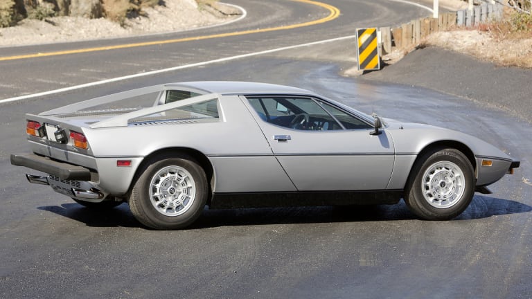 Il est évident que l’on ne choisit pas ce genre d’auto en fonction de critères triviaux, tels ceux relatifs à l’habitabilité, mais les soi-disant places arrière de la Merak — là où le plus encombrant V8 de la Bora avait dicté une cellule rigoureusement biplace — relèvent tout de même de la plaisanterie pure et simple ; vous pourrez tout juste y déposer une veste, à moins qu’un cul-de-jatte ne figure parmi vos amis. Qu’importe, au fond ? C’est de toute façon à son conducteur que l’engin réserve les sensations les plus réjouissantes. Réjouissantes, oui, mais pas aussi exaltantes que l’agressivité stylistique de la voiture pourrait le suggérer. Devant ce museau effilé, ces surfaces vitrées parcimonieuses et ce profil dont la hauteur évoque celle d’une barquette de compétition (113 centimètres sous la toise !), l’on pourrait facilement se laisser griser, d’autant que la musicalité naturelle du V6 s’exprime ici plus librement que dans la Citroën. Malheureusement, il n’est pas nécessaire de rouler longtemps pour comprendre que l’agilité ne figure pas au premier rang des qualités de la Merak qui, en dépit d’une architecture à moteur central a priori plutôt favorable à ce genre d’exercice n’apprécie pas beaucoup qu’on la brutalise. Lourde et bâtie sur un empattement relativement long de 2,60 mètres, l’auto n’est guère à son aise dans les itinéraires sinueux, à moins d’adopter un style de conduite plus paisible que dynamique — mais dans ce cas, autant rouler en Ami 6. Plus à l’aise sur autoroute, la Maserati apprécie les grandes courbes bien plus que les virages serrés et ne se montre réellement plaisante que sur un revêtement irréprochable. Mais dans tous les cas, la générosité de l’instrumentation n’est pas là que pour le folklore : les différents manomètres vous seront précieux pour contrôler en temps réel l’état de santé facilement chancelant du six-cylindres qui mugit dans votre dos…