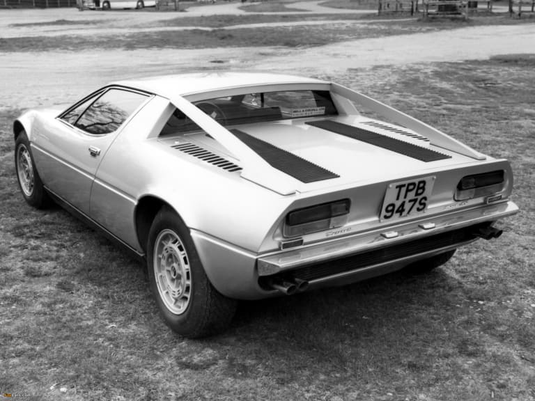 Ce sont les visiteurs du Salon de Paris 1972 qui eurent le privilège d’assister à la première apparition de la Merak. À ce moment-là, c’est le Quai de Javel qui contrôlait Maserati et, comme chacun sait, les ressources ingénieriales des Italiens avaient été largement mises à contribution par Citroën dans le but de développer une SM aussi ambitieuse que difficile à vendre. Toutefois, ainsi que nous vous l’avons déjà narré, l’influence du bureau d’études de la rue du Théâtre avait également franchi les Alpes et, de la sorte, la Bora — première Maserati de route à moteur central — comportait plusieurs caractéristiques typiques des « Hydroën » de l’époque, combinant ainsi certaines des fabuleuses inventions de Paul Magès aux spécificités d’une machine dont le huit-cylindres surclassait sensiblement les aptitudes de la SM. Des citroënismes dont, à ses débuts, la Merak fut encore plus prodigue puisque son moteur, son système de freinage et sa planche de bord furent directement repris de la voiture française. En exploitant la base de la Bora, l’idée consistait à élaborer une déclinaison moins puissante d’icelle, tout en conservant une esthétique très proche ; il n’était bien sûr pas question de dessiner une carrosserie distincte et la Merak (que l’on aurait pu nommer Bora V6) reprit donc l’essentiel de la physionomie de son aînée, ce qui ne saurait constituer un reproche dans l’absolu mais qui a néanmoins nui à l’identification spontanée du modèle par le public visé.