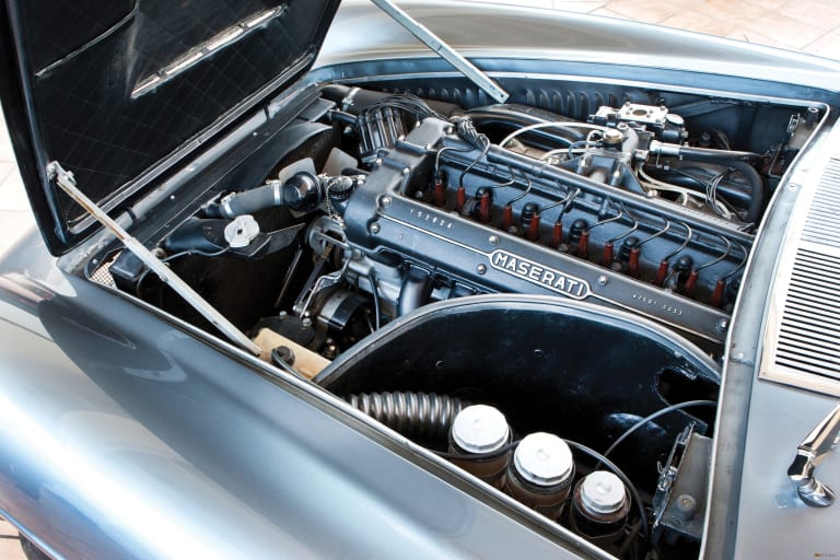 Au début des années 1960, le catalogue Maserati impressionne par sa diversité, s’agissant d’une entreprise encore très artisanale dans son fonctionnement, ce dont témoignent des volumes de production qui ne dépassent pas les quelques centaines de voitures par an. Fondée en 1914 par les frères Maserati, la firme appartient à la famille Orsi depuis 1937 et a en partie fondé sa réputation sur un impressionnant palmarès sportif. Malheureusement, des vicissitudes d’ordre financier ont contraint Maserati à renoncer à la compétition après 1958, condamnant dès lors l’usine de la via Ciro Menotti à se contenter d’exploiter la résonance encore fraîche de ses exploits en course – dont les deux moteurs dont la marque dispose alors proviennent en droite ligne. Ainsi, le V8 des 450S de course a-t-il opportunément trouvé refuge sous le capot de la très confidentielle 5000 GT, tandis que le 6-cylindres issu des 250F s’est chargé, dès 1957, d’animer la 3500 GT, toute première Maserati de « grande » diffusion (les guillemets sont voulus…).