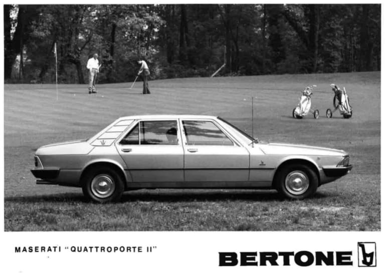 Pour autant, cela n’abolissait pas le potentiel du châssis et de la mécanique de la SM qui, chez Maserati, pouvaient très valablement servir d’armature à la remplaçante de la Quattroporte commercialisée depuis 1963 et dont la formule avait été reprise par certains artisans comme Iso Rivolta, De Tomaso ou Monteverdi. Ainsi, la deuxième génération du modèle allait néanmoins tourner le dos à plusieurs de ses fondamentaux, puisqu’à l’automne de 1974 c’est avant tout une habile évolution de la SM que les visiteurs du Salon de Paris purent découvrir sous la forme d’une très classique berline à quatre portes, développée en un temps record et — surtout — à moindres frais. Dessinée par Marcello Gandini pour le compte de Bertone, la Quattroporte II ne restera pas dans les annales du design : le béotien qui s’attarderait à contempler cette grosse quatre-portes patricienne aux proportions convenues n’aurait aucune chance d’y déceler les schèmes citroënistes ; il faut être un connaisseur attentif pour repérer les enjoliveurs de DS ayant équipé la plupart des exemplaires produits ou encore les six projecteurs à assiette constante. Les indices sont plus nombreux à l’intérieur de l’auto, qui reprend certaines pièces d’accastillage présentes à bord des SM (dont, sur certaines voitures, le levier de vitesses typique d’icelles) ; l’atmosphère demeure pourtant très italienne, avec ce qu’il faut de vrai cuir et de boiseries authentiques, sans toutefois sombrer dans les outrances des futures Biturbo.