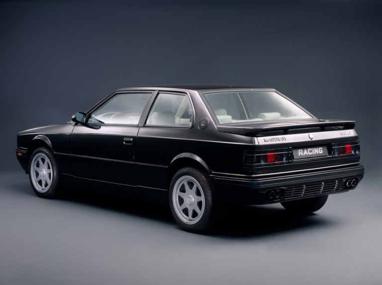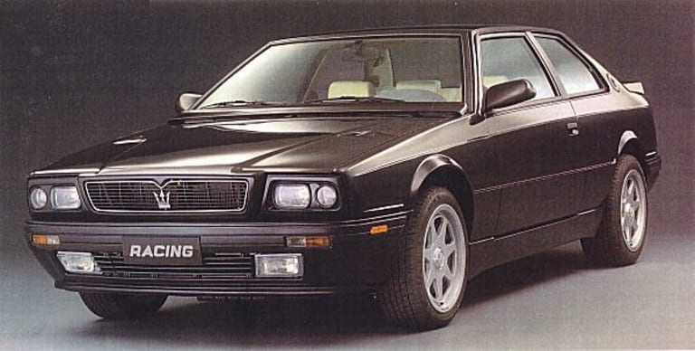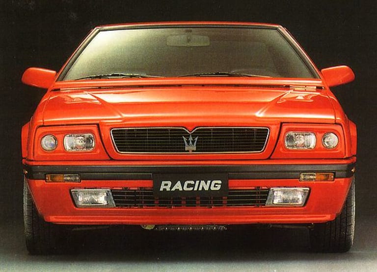 Si elle n’est pas aussi aboutie que la Ghibli, la Racing n’en est pas moins très intéressante. Présentée comme il se doit à la fameuse conférence de presse de décembre, en 1990, elle succède dans l’ordre des nouveautés à la Shamal, présentée elle en décembre 1989. Elle en reprend les tics stylistiques dus à Marcello Gandini, initiant le designs des Biturbos des années 90. Les 2.24v, 4.24v, 430 (lire aussi: Maserati 430), Spyder (lire aussi: Maserati Spyder) puis Ghibli s’en inspireront par la suite. Cette Racing n’est disponible qu’en deux couleurs, rouge ou noir. Seule la version noire reprendra les feux arrières fumés de la Shamal, la rouge gardant les feux traditionnels. Si son nom évoque la course, la Racing ne sera jamais destinée à la compétition.