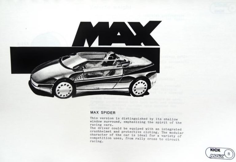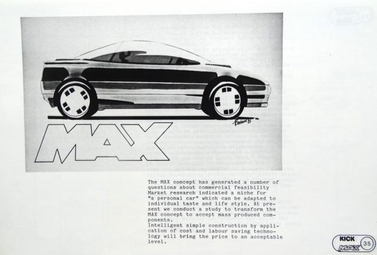Entre 1985 et 1989, Kick Design va faire évoluer son petit roadster, avec 5 prototypes construits dans ses ateliers de Hemond, aux Pays-Bas. Dénommé Max, il va donner naissance à une société dédié à la production en série, Max Motors. A l’instar des petits constructeurs anglais comme Quantum (lire aussi : Quantum H4) ou plus tard le constructeur belge Minari (voir ici : le club des propriétaires de Minari en Angleterre), Max Motors ambitionnait d’écouler une centaine de Roadster par an.