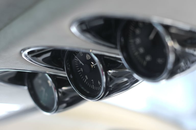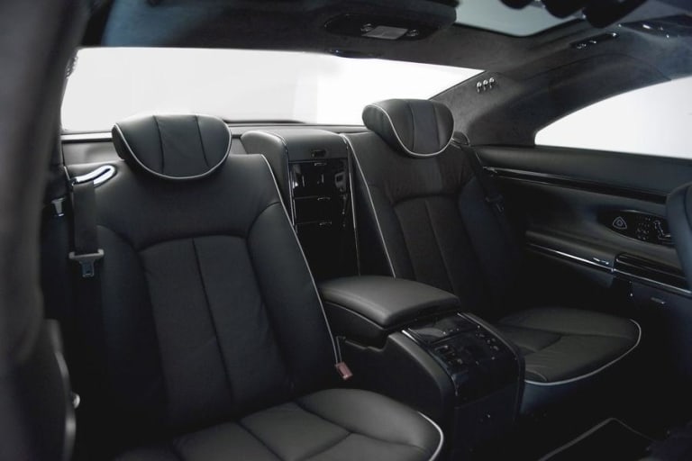 Si les modifications de carrosserie sont légion, l’habitacle évolue moins. La planche de bord reste inchangée, au contraire des sièges avant qui deviennent des baquets avec ceinture de sécurité intégrées. Les deux sièges individuels arrière, électriques, ventilés et massants procurent un confort absolu. Rarement un coupé n’aura été aussi spacieux. Maybach oblige, les trois compteurs permettant aux hôtes arrière de surveiller allure, heure et température extérieure trônent fidèlement au milieu du pavillon. Enfin, toutes les personnalisations sont possibles, du minibar avec coupes à Sekt (le mousseux d’Outre-Rhin) aux écrans TV dans les sièges, en passant par la sono haut de gamme livrée avec deux casques siglés Maybach – comme les deux téléphones ! – et la sellerie qui peut, comme la peinture, être bicolore.