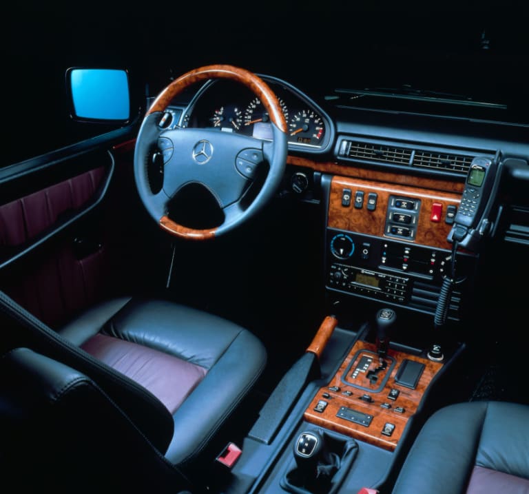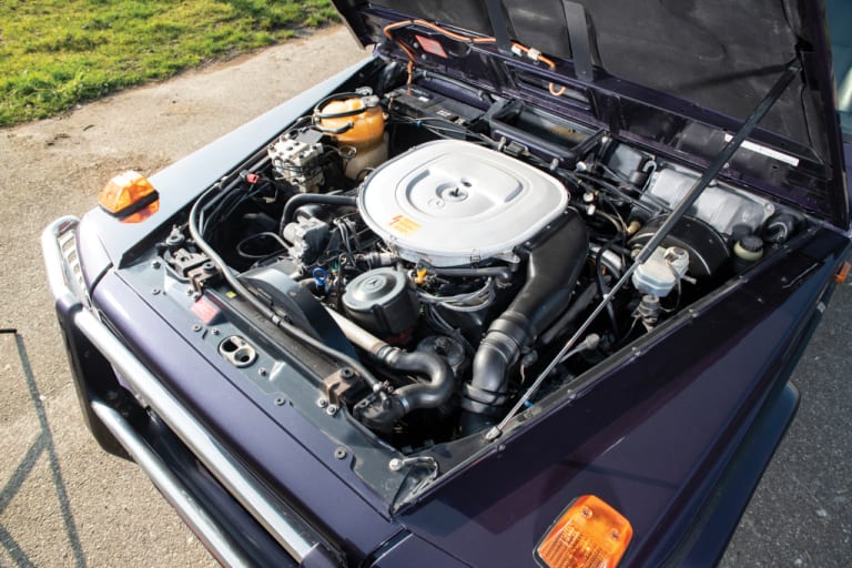 D’autant que, côté moteur, Mercedes la joue pingre. Pas question de mettre le M119 des 500 E ou SL : le 500 GE devra se limiter au M117, un V8 de 5 litres, mais qui date de 1971, et qu’on trouvait auparavant sur les SL R107 ou les Classe S W126 rangées au placard depuis quelques années. Avec 231 chevaux et seulement 2 soupapes par cylindres, on est loin des 320 du M119. Cela dit, à ce moment-là, on doute encore de la pertinence de plus de 300 chevaux pour un 4×4.