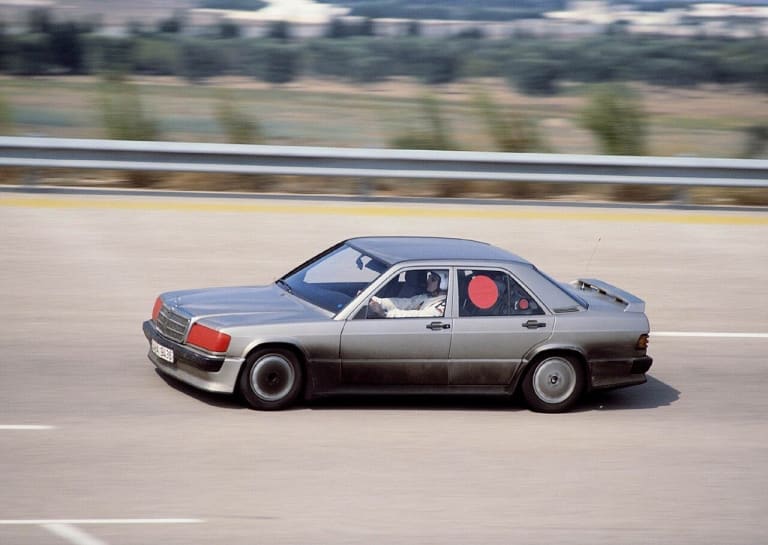 Pourtant, le catalogue des motorisations disponibles à la sortie de la voiture n’avait rien de particulièrement enthousiasmant : s’appuyant sur le M102, un groupe de 2 litres de cylindrée introduit en 1980 dans la gamme 123, sa variante la plus performante ne dépassait pas les 122 ch, puissance notoirement sous-dimensionnée en comparaison des ressources du châssis. Il y avait donc anguille sous roche, ce que Mercedes confirma le mois d’août 1983 en dévoilant, dans le cadre d’épreuves d’endurance sur le circuit de Nardo, sa 190 de pointe, dont les caractéristiques avaient de quoi allécher ceux qui, depuis de longues années, avaient pris l’habitude de se fournir à Munich… Présentée sous un accoutrement coursifié, l’auto n’en était pas moins très proche de la version de série dont les premières images officielles furent diffusées durant l’été 1983 et dont l’accastillage ô combien suggestif rappelait davantage les réalisations d’AMG – encore indépendant de Mercedes en ce temps-là – que la sobriété bourgeoise à laquelle la clientèle de la marque était habituée. Large spoiler avant, aileron de coffre, élargisseurs d’ailes et jupes latérales, le tout combiné à une assiette surbaissée par rapport aux 190 « civiles » : pour la première fois, le constructeur souabe se laissait aller à des excentricités que sa communication avait jusqu’alors dédaignées, les considérant volontiers comme l’apanage des marques populaires et des faisans de banlieue toujours prêts à enjoliver leurs Ford Taunus ou leurs Opel Ascona. Bien sûr, on était ici fort loin de certains bricolages tolérés par la concurrence, d’autant plus que la fiche technique de l’engin, qui était allé quérir sa nouvelle culasse chez Cosworth, ne pouvait qu’inspirer le respect…