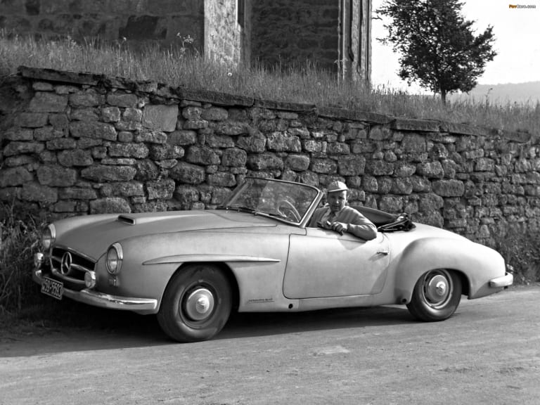 Nous sommes à New York, en février 1954. Dans le décor du Madison Square Garden sont exposées deux voitures à l’importance cruciale pour leur constructeur, et qui n’auraient pas vu le jour sans le flair commercial, le sens de l’initiative et les capacités de persuasion d’un homme providentiel : nous avons nommé le célébrissime Max Hoffman, qui avait ouvert les portes du marché nord-américain à plusieurs marques européennes trop heureuses d’accéder à un tel eldorado. C’est lui qui, impressionné par la 300 SL de compétition (type W194), avait réussi à convaincre les dirigeants de la Daimler-Benz d’en préparer une version routière — et la suite est connue : la fantasmatique Gullwing intégra directement le panthéon des automobiles historiques. Avec ses lignes saisissantes dues au talent du grand Karl Wilfert, son châssis tubulaire, ses ouvrants en aluminium, ses portes papillon et son six-cylindres à injection directe, l’engin avait toutes les chances d’entrer vivant dans la légende. Une fois de plus, Hoffman avait vu juste ; mais il ne se contenta pas d’avoir suscité l’avènement de la plus fascinante supercar de son temps, suggérant dans le même élan aux patrons de Mercedes d’investir, en parallèle, le très juteux segment des roadsters « grand public » (tout est relatif, n’est-ce pas) dans lequel plusieurs concurrents britanniques ou italiens avaient déjà commencé de s’ébattre, pour le plus grand bénéfice de leurs finances respectives…