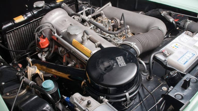 De la sorte, aux côtés de la 300 SL, les visiteurs de l’exposition new-yorkaise purent découvrir le prototype d’un cabriolet biplace, baptisé donc 190 SL et dont les formes évoquaient irrésistiblement une version ouverte du type W198. Hoffman s’était engagé auprès de l’usine à commander mille exemplaires de chacune des deux voitures et, au vu des réactions enthousiastes de leur clientèle potentielle, elles entrèrent toutes deux en production dans les mois qui suivirent, à des altitudes tarifaires bien différentes cependant. Car la 190 SL, nonobstant son caractère spécifique de roadster, ne s’adressait pas aux mêmes amateurs que son inspiratrice, en dépit d’une physionomie très similaire — en particulier de face. De fait, il suffisait d’examiner la fiche technique de la voiture pour s’en persuader : en lieu et place du gros 3 litres siégeait un quatre-cylindres de 1897 cm3, entièrement inédit et qui devait d’ailleurs beaucoup au six-cylindres de la 300. Développant 105 ch à 5700 tours/minute et systématiquement associé à une boîte manuelle à quatre rapports, ce bloc n’avait rien de particulièrement flamboyant et, par exemple, ne présentait pas le caractère fougueux d’un bialbero Alfa, tel qu’on pouvait le trouver dans le spider Giulietta ; mais au demeurant, il s’agissait là d’un niveau de puissance déjà respectable dans l’absolu, si l’on considère qu’une Porsche 356 ne dépassait alors pas les 75 ch dans le meilleur des cas. Cela posé, et comme on va le voir, la Mercedes ne s’adressait de toute façon pas tout à fait aux mêmes amateurs que ses rivales et proposait une formule sans réel équivalent sur le marché.