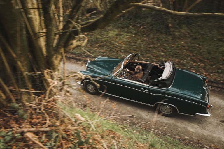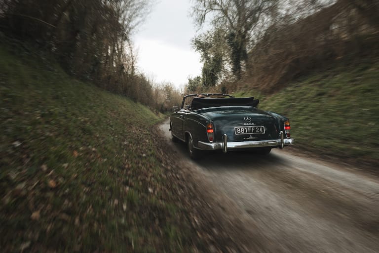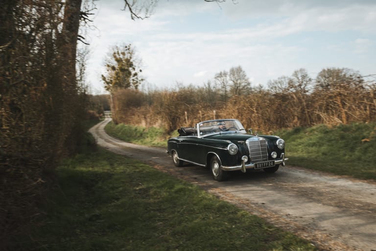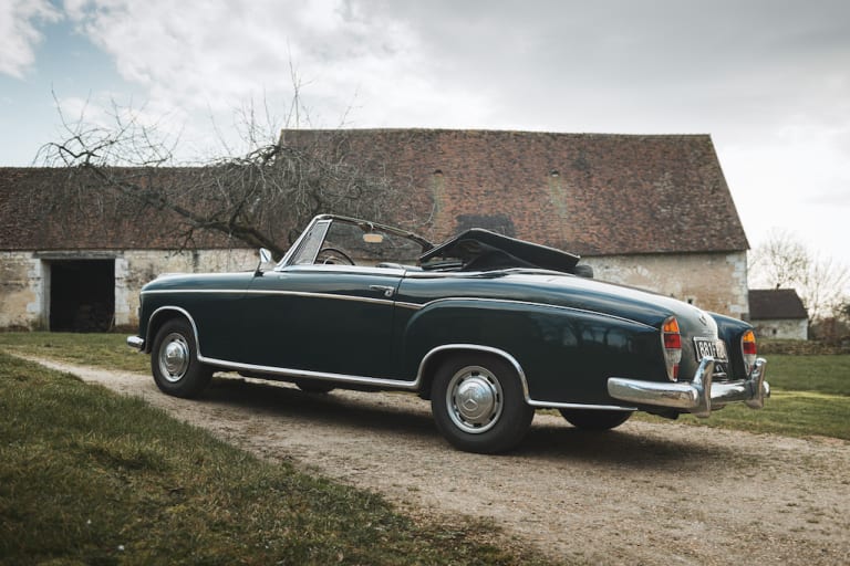 La Mercedes-Benz « Ponton » a existé en cinq versions de 1954 à 1962, équipées de moteurs à quatre ou six cylindres et disponibles en berline, en coupé et en cabriolet. Les modèles six-cylindres disposaient de deux types d’alimentation, soit par carburateurs (les modèles “S”), soit par injection (les modèles “SE”). La voiture de Serge est une 220 S Cabriolet de 1959.