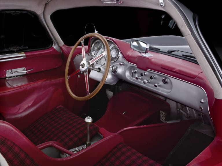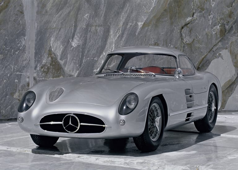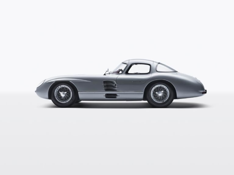 Si Daimler a choisi de se séparer de l’une des deux autos au profit d’un collectionneur privé (pour la bagatelle de 135 millions d’euros) lors d’une vente aux enchères organisée en 2022 par RM Sotheby’s, celle d’Uhlenhaut figure toujours parmi les collections du constructeur, qui l’expose avec un orgueil compréhensible dans le merveilleux écrin que constitue le Mercedes-Benz Museum de Stuttgart. Même pour ceux qui — à l’instar de votre serviteur — y passent environ le tiers de leur existence, retrouver cette longue carrosserie grise sous l’éclairage subtil d’un hall où ses voisines se nomment 300 SL roadster ou, plus modestement, une berline Ponton — suscite une émotion chaque fois renouvelée. Si la firme allemande a pu écrire une légende irréfutable, c’est en partie grâce à cette auto, pourtant peu présente dans une mémoire collective phagocytée par la 300 SL « classique » (pas exactement un véhicule de grande diffusion mais construit tout de même à 1400 unités de 1954 à 1957) dont elle diffère toutefois à bien des égards. Elle nous rappelle fort opportunément que la première Sport Leicht de l’histoire de Mercedes a d’abord et avant tout été pensée pour la course, la version routière s’apparentant presque à un accident de l’histoire. Près de soixante-dix ans plus tard, sans doute éprouve-t-on quelques difficultés à imaginer le choc que produisit l’apparition de cet engin moins d’une décennie après la guerre et, qui plus est, conçu dans un pays dont l’outil industriel, pour les raisons que chacun connaît, avait été en grande partie détruit !