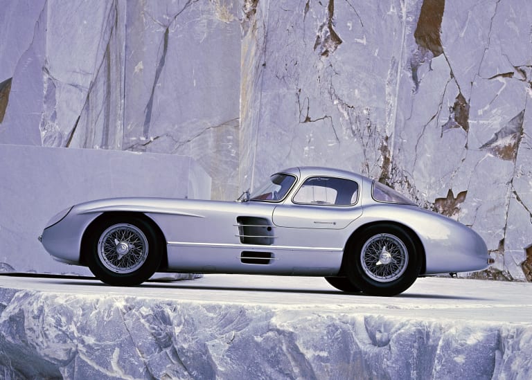 Avant-guerre, les flèches d’argent avaient déjà brillé sous l’égide de l’un des plus fameux directeurs de course de l’histoire en la personne d’Alfred Neubauer et, déjà, avec la précieuse contribution d’Uhlenhaut ; aux mains de Rudolf Carracciola ou de Hermann Lang, les W125 et W154 avaient ainsi remporté plusieurs épreuves de légende, à Berlin, Monaco ou Tripoli. Bien entendu, au lendemain du conflit la course ne faisait pas partie des priorités mais le premier championnat du monde de Formule 1 se courut néanmoins dès 1950 — Fangio remportant le titre pour Mercedes en 1954 et 1955 — tandis que les premières 24 Heures du Mans de l’après-guerre eurent lieu en 1949. C’est d’ailleurs dans la Sarthe que la marque à l’étoile stoppa brutalement son engagement en compétition après l’accident de Pierre Levegh, qui entraîna 81 personnes dans la mort. Ce jour funeste de juin 1955, Levegh pilotait une 300 SLR de course dont les caractéristiques tutoyaient — et pour cause — celles du coupé Uhlenhaut. L’architecture des deux autos s’avérait identique et se basait sur la W196 de Formule 1 : à l’avant d’une structure tubulaire se blottissait un huit-cylindres en ligne de 2982 cm3 à double allumage et alimenté de surcroît par une injection directe mécanique, laquelle constituait une première mondiale. Issue d’un programme avorté consistant à élaborer un modèle hybride entre la 300 SL et la SLR de course, la carrosserie fermée de la SLR de route visait à en rendre possible l’usage courant et, si elle reprenait les formes générales de la 300 SL, elle s’en différenciait à maints égards, aboutissant à une physionomie sensiblement plus racée.