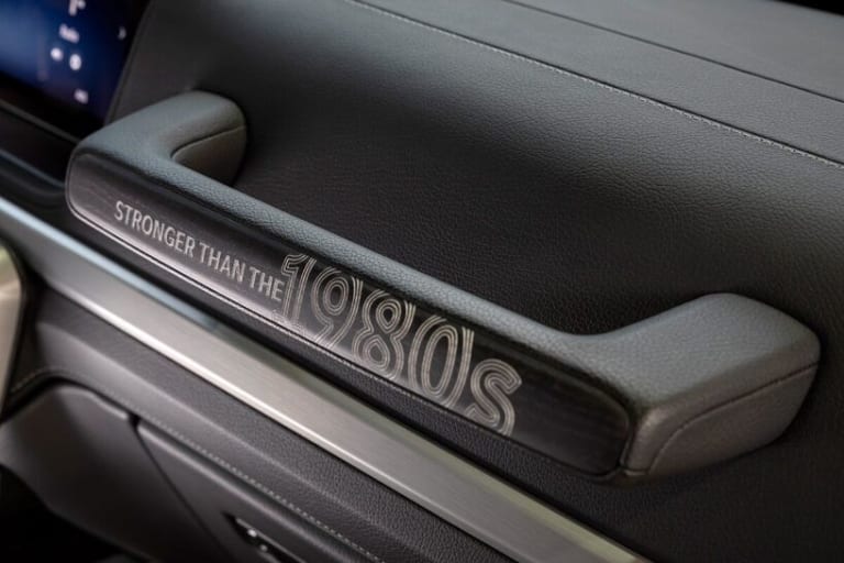 Dans ces conditions, la série spéciale Stronger than the 1980s n’ambitionne pas seulement de battre le record de la dénomination commerciale la plus longue. Tirée à 460 exemplaires (en guise de clin d’œil au type usine de la première G-Wagen, G460), l’auto opère une forme de retour aux sources qui rappelle un peu, dans un autre contexte, la démarche de Porsche avec la récente 911 Spirit 70 ; il s’agit, là aussi, de faire du vieux avec du neuf. La technologie demeure contemporaine mais elle se dissimule sous d’attachants oripeaux chargés de nous ramener à l’aube des eighties. Ainsi, les trois coloris disponibles – vert Agave, crème ou beige Colorado – sont directement repris du nuancier d’époque. Il en va de même de la sellerie, tandis que de nombreux éléments du décor extérieur sont réalisés en noir mat, censé rappeler la vocation première du Geländewagen. Et Mercedes a même songé à utiliser des clignotants de couleur orange et à reprendre les logos en vigueur il y a quatre décennies !