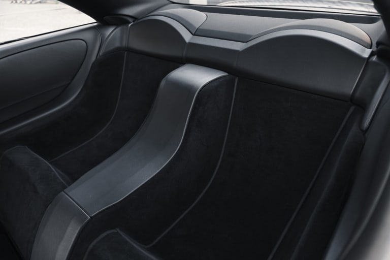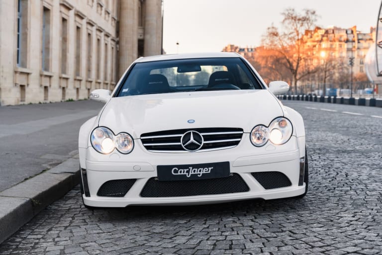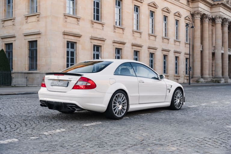 Cette appellation, inaugurée par la très confidentielle SLK 55 AMG l’année précédente, n’a rien d’anodin et va bien au-delà d’une simple série spéciale, la voiture étant très significativement transformée. Élaborée sur la base du CLK safety car alors utilisé dans le championnat du monde de F1, la Black Series s’éloigne résolument de la discrétion affichée par le CLK 63 « de base ». L’on remarque immédiatement les ailes hypertrophiées abritant des jantes de 19 pouces au dessin inédit, l’assiette surbaissée et les boucliers revisités de façon à améliorer le refroidissement de la mécanique. Pour sa part, le V8 affiche à présent 507 ch tandis que la vitesse maximale est relevée de 250 à 300 km/h. Côté châssis, l’auto dispose d’une suspension entièrement paramétrable, d’un différentiel mécanique à glissement limité et d’un ESP plus permissif qu’à l’origine. L’habitacle n’est pas en reste et ne comporte plus que deux places, sous la forme de baquets tendus de daim véritable ; et l’ensemble est d’autant plus exclusif que la production n’a pas dépassé les 500 exemplaires, dont plus des deux tiers sont partis aux États-Unis. Actuellement proposée à la vente par CarJager, la voiture présentée sur les photos accompagnant cet article constitue donc une très rare opportunité d’acquisition sur le marché européen. N’hésitez pas à nous contacter !