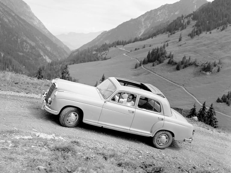 La production de la 170 conçue avant-guerre reprend dès 1949, mais Daimler-Benz a conscience qu’il lui faut innover pour conquérir le monde. Après avoir lancé en 1951 la désirable mais élitiste typ 300 (W186), Mercedes va décider de descendre un peu en gamme avec une toute nouvelle voiture, la “Ponton” 180 (W120). La marque de Stuttgart a déjà dans l’idée de séduire le marché américain et s’inspire des carrosseries 3 volumes déjà en vogue aux USA pour offrir une voiture moderne, à coque autoporteuse et dont les ailes et les garde-boues ne sont plus séparés (le style “Pontoon” en anglais). Avec son 4 cylindres de 1,8 litre de 58 chevaux, elle est donc plus accessible tout en conservant une excellente qualité de fabrication.