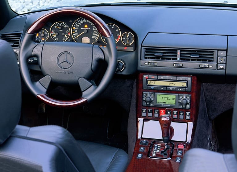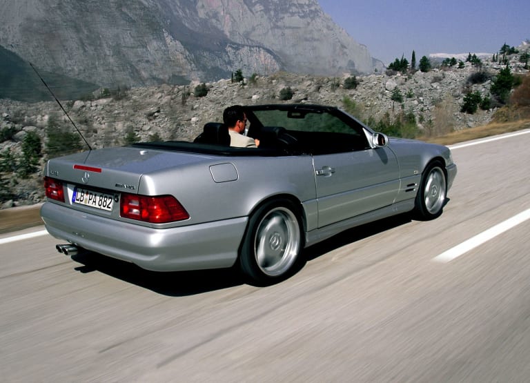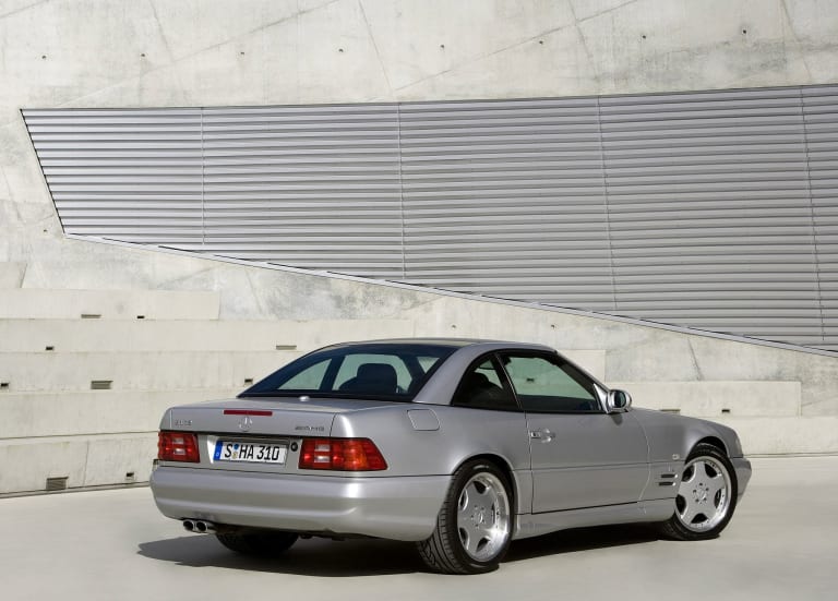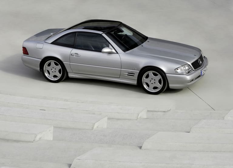Lancé au printemps de 1989, le roadster SL de la série R129 incarna, en son temps, une rupture radicale avec son prédécesseur. Produite dix-huit années durant et prodigieux commercial pour un modèle aussi onéreux, la SL R107 avait largement fait son temps à la fin des années 80, même si le marché nord-américain continuait de la plébisciter, millésime après millésime. Enfin commercialisé après une longue gestation, son successeur marqua d’emblée les esprits par l’extrême sophistication de ses équipements de sécurité et de confort, sans parler de trains roulants – étroitement dérivés de ceux de la série 124 – unanimement salués par la presse spécialisée et susceptibles de transmettre au sol un niveau de puissance en très nette augmentation. Des 245 chevaux délivrés par les ultimes 500 et 560 SL, l’on passait en effet à 326 chevaux développés par le V8 5 litres maison, dorénavant nanti de culasses à quatre soupapes par cylindre. Ainsi gréée, la nouvelle 500 SL – confortable et rapide, mais aussi plus puissante qu’une Ferrari 348, qu’une BMW 850i ou qu’une Porsche 964 Turbo 3.3 – pouvait revendiquer sans ambages sa place au royaume des automobiles de grand tourisme, proposant par surcroît, grâce au hard-top livré de série, les avantages de la formule « deux voitures en une ». Pourtant, ce n’était qu’un début…
