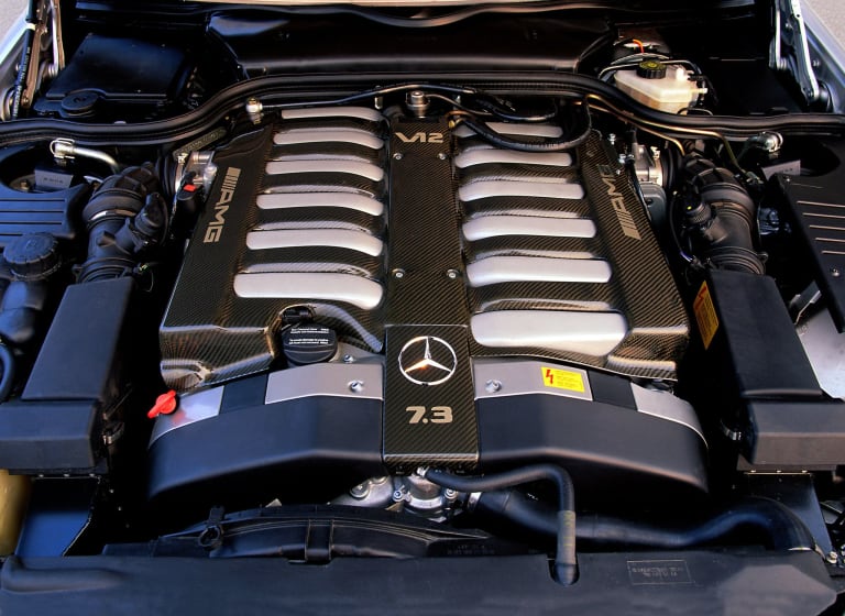 Commercialisée en toute discrétion à partir de 1999 en parallèle d’une SL 70 moins ambitieuse, la SL 73 AMG n’attirait pas l’attention du profane, à l’inverse de sa lointaine descendante, la SL 65 AMG Black Series présentée une décennie plus tard. Sa carrosserie n’était pas modifiée et ne comportait aucun appendice aérodynamique outrancier ; il fallait un œil exercé pour repérer les jantes de 18 pouces et, le cas échéant, le discret logo apposé sur la malle. En somme, une SL « comme les autres » en apparence… mais avec 525 chevaux et 750 Nm à disposition, la traditionnelle bride électronique pouvant, sur demande, être relevée de 250 à 300 km/h. Construite à seulement quarante-deux unités jusqu’en 2001, l’auto était vendue environ 1,2 million de francs, soit à peu près 280 000 euros de 2025 (à la commande, il fallait choisir une SL 600 « de base », puis l’agrémenter du package technique spécifique permettant de transformer l’engin). Abandonné par Mercedes lors de l’arrêt de production de la série 129, le 7,3 litres a cependant poursuivi son brillant parcours en animant les Pagani Zonda à partir de 2002 et jusqu’à la fin de la carrière de la supercar italienne. C’est aujourd’hui la plus chère des youngtimers à l’étoile ; en 2024, RM Sotheby’s a vendu un exemplaire de 1999 pour la modique somme de 610 000 dollars ! Mais quand on aime…