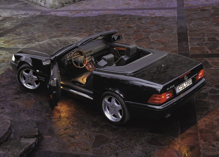 Tout à la fois confortable, rapide, dotée d’excellentes qualités routières et d’une finition à faire sangloter les propriétaires de Ferrari 412, la R129 se caractérise avant tout par une sophistication hors normes pour l’époque. Cela va de l’arceau de sécurité relevable automatiquement en cas de retournement à la suspension hydraulique semi-active ADS en passant par le système antipatinage ASR ou le différentiel autobloquant ASD, sans oublier l’incontournable ABS dont Mercedes aura été à la fois le pionnier et le vulgarisateur. Mais le véritable morceau de bravoure de l’auto, c’est bien entendu sa capote, certes infiniment moins soignée dans sa réalisation que celle d’une Rolls-Royce Corniche mais dont la simplicité de maniement laissa pantois plus d’un essayeur, étant entendu que celle-ci découlait d’une complexité fonctionnelle alors sans équivalent sur le marché. Plusieurs électrovannes et vérins sont de la sorte nécessaires pour permettre à la toile de se déplier ou de se replier, de façon entièrement automatique, la manœuvre ne nécessitant que d’agir sur un seul bouton, ce qui constitue un progrès marquant par rapport à la R107. De plus, et comme sur cette dernière, le toit souple de la R129 disparaît entièrement sous un couvre-capote métallique, préservant ainsi la pureté de la ligne une fois décapotée.