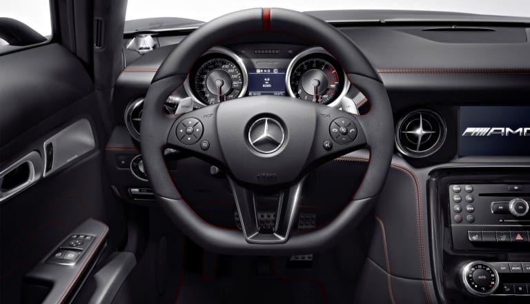 Forte de 571 ch, même la SLS « de base » (si l’on ose écrire) tutoie sans complexes une Porsche 997 GT2 RS ou une Ferrari 458. La « Black Series » poussera la plaisanterie encore plus loin mais chacun aura d’emblée noté que l’auto ne joue plus dans la même cour que son prédécesseur – ce qui se vérifie d’ailleurs à la lecture du tarif. Même si l’on demeure assez loin d’un produit low cost, la SLS AMG réclame, à son lancement, un peu moins de 190 000 euros, somme non négligeable mais sans rapport avec les 460 000 euros précédemment exigés pour repartir au volant d’une SLR McLaren… Probablement échaudé par l’accueil réservé à cette dernière et sans le proclamer sur les toits, Mercedes a adapté son offre et, pour l’heure du moins, renonce à investir le marché des supercars qui, à ce moment-là, se nomment Porsche 918 ou Ferrari LaFerrari. De fait, la SLS vient judicieusement compléter la gamme en proposant, aux côtés d’une SL pensée comme un grand tourer orienté vers le luxe, une offre plus sportive et plus radicale – elle sera d’ailleurs également déclinée sous la forme d’un roadster, en plus du coupé que ses spectaculaires portes papillon n’ont pourtant pas fait tomber dans les pièges du retro-design.