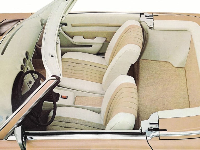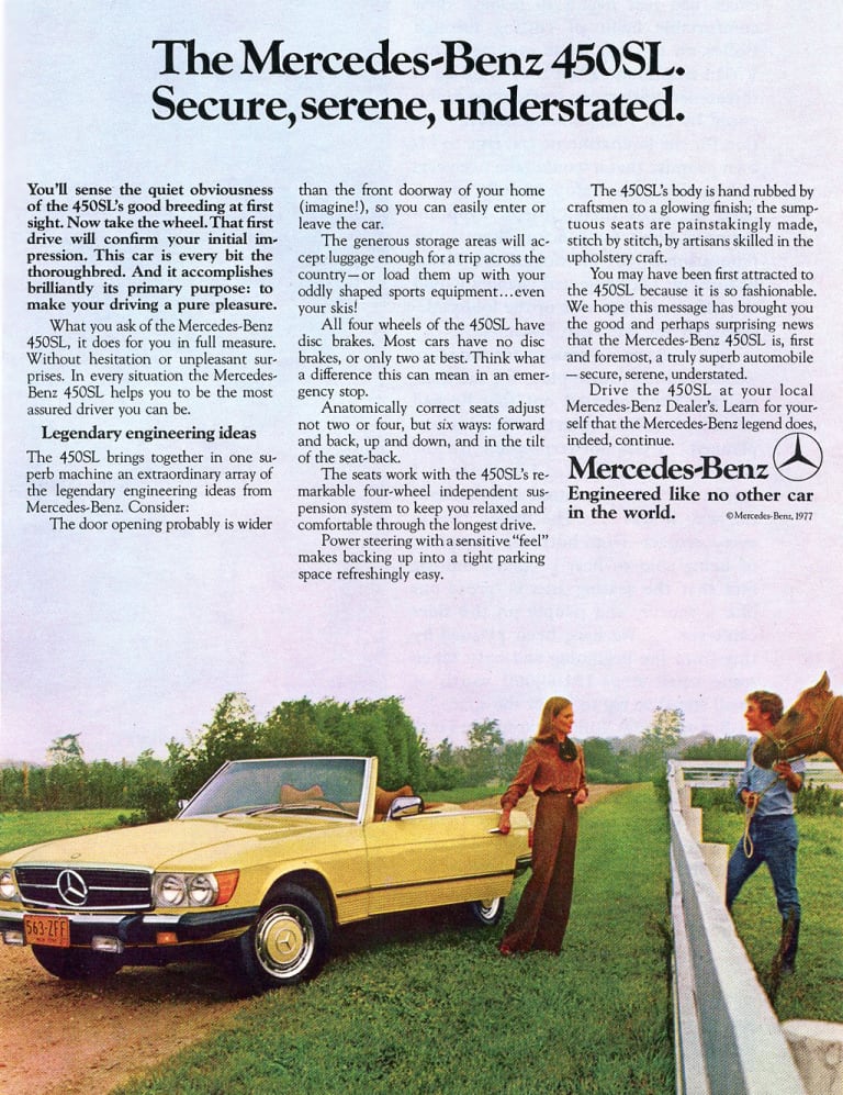 Pour qui est né dans les années 70, c’est comme si la R107 avait toujours existé, dans les rues comme à la télévision ou au cinéma, et ce malgré son statut de voiture de luxe. Il faut d’ailleurs bien garder à l’esprit qu’il ne s’agit absolument pas d’une voiture de sport. La précédente SL (la W113) s’était vendue à près de 40 % aux USA et il était clair, dans les esprits des concepteurs des R/C107, que son héritière serait conçue en priorité pour le marché américain. Ainsi, au lancement en 1971, pas d’autre option qu’un V8 de 4.5 litres de « seulement » 195 chevaux (pour les USA) ou 3.5 et 200 ch (pour le reste du monde) : priorité au son des 8 cylindres, au couple, et au cruising à l’américaine. De toute façon, son poids et son châssis vous rappelleront vite ses limites en conduites sportives. Il faut vraiment envisager le R107 (tout comme le C107) comme un outil de plaisir simple : décapoté, pépère en virage, et pourquoi pas véloce en ligne droite. De toute façon, la SL était à l’époque un signe extérieur de réussite plus qu’un objet de pilotage.