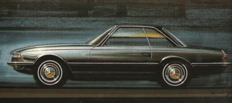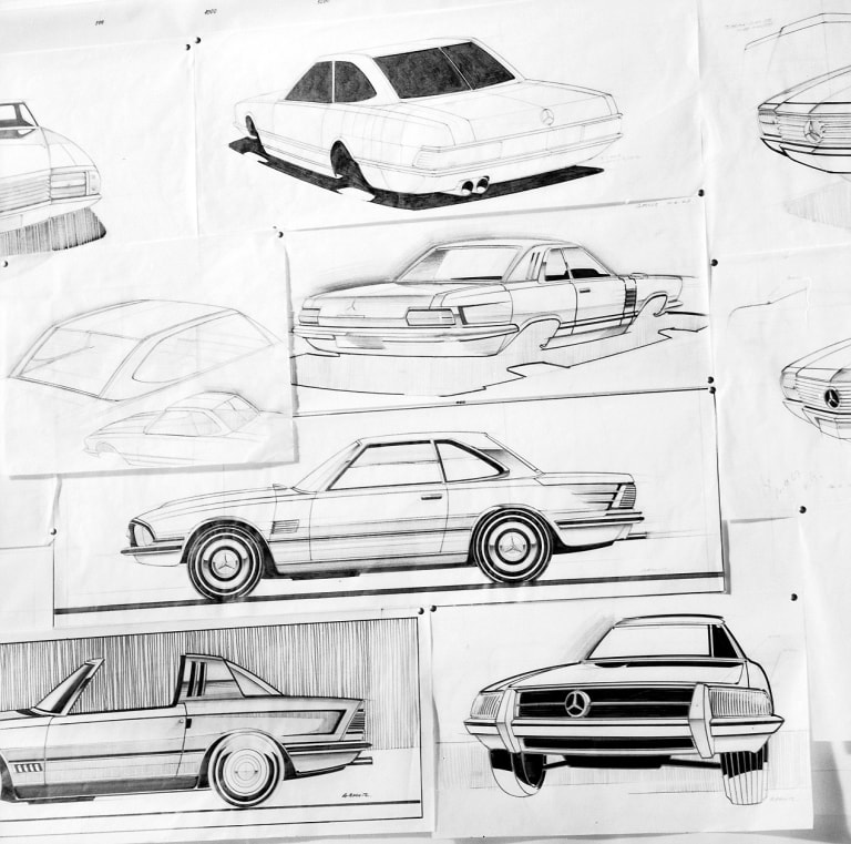 Pour réaliser leur nouveau couple roadster/coupé, les designers allemands (Joseph Gallitzendörfer et Freidrich Geiger) allaient la jouer fine : les W107 restaient dans la lignée des W113 sur le principe mais s’en détachaient suffisamment pour paraître en rupture. Osant abandonner le toit Pagode si caractéristique (et dû au designer français Paul Bracq), la R107 initiait le nouveau design Mercedes qui deviendra un classique et qu’on verra un an plus tard sur la nouvelle Classe S W116. Adieu les phares avant verticaux de sa devancière (ou de la berline W114 dont elle dérive techniquement), place aux phares horizontaux (à l’avant comme à l’arrière). Les feux arrière inauguraient ce qui deviendra une signature : un dessin « rayé » antisalissure ! Entre l’aînée et la cadette, on changeait de monde, la première restant très sixties (non sans rappeler les regrettées Facelia) quand la seconde semblait encore dans le coup en 1989 à son remplacement, preuve de la modernité de sa ligne.
