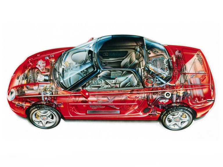 La configuration MR étant retenue pour ses bénéfices en pilotage, il fallut trouver une possibilité d’offrir plus de chevaux à la nouvelle petite MG. À partir d’un brevet peu connu datant des années 70, Rover joua le va-tout « VVC » : un disque décentré sur l’arbre à cames offrant différents calages, dans le but de modifier les temps d’ouverture des soupapes. Plus de puissance dans les tours élevés, plus de couple à bas régime, en deux mots : une admission variable (voui voui, comme le VTEC de l’ami Honda). La MGF 1.8i VVC promet ainsi 145 chevaux. Pour ne rien faire comme tout le monde, les Anglais lui collent une suspension Hydragas, aussi décriée et adulée que l’hydropneumatique Citroën. Un choix malin, car il s’est révélé offrir de bonnes prestations dans une configuration de véhicule à moteur central, aux masses très équilibrées. Pour finir la recette, une petite capote que l’on balance vers l’arrière en quelques secondes, et servez chaud.