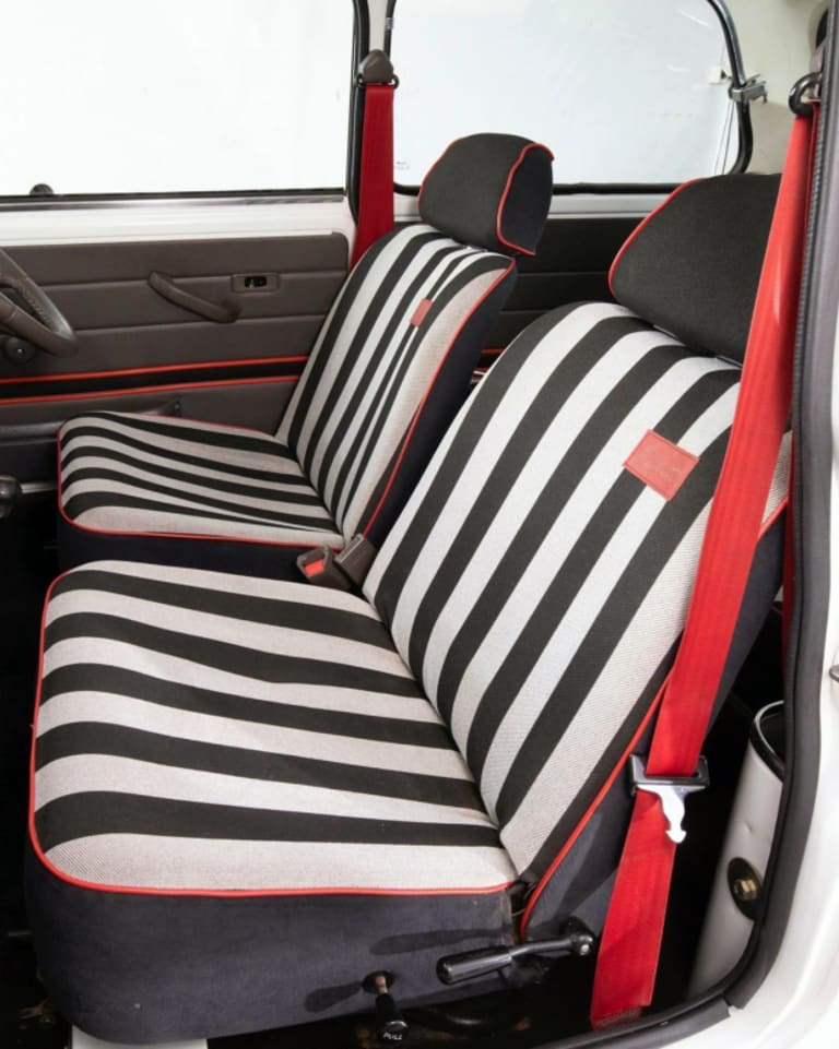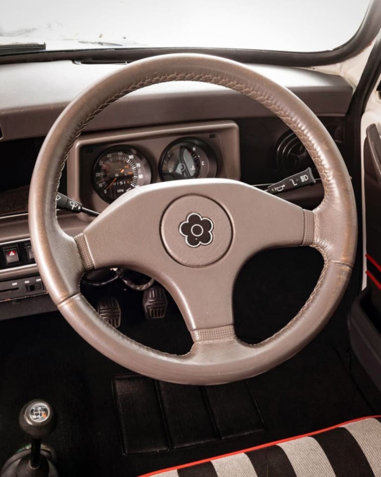 C’est à l’intérieur qu’on sent plus la patte de la créatrice : les sièges sont recouverts d’un tissu rayé noir et blanc, avec liseré rouge. Les contre-portes, elles aussi, récupèrent une bande noire entourée de rouge. Les ceintures de sécurité, elles, deviennent entièrement rouges. Le volant s’offre le logo de Mary Quant, une sorte de fleur stylisée. Ainsi gréée, la Mini Designer coûte 4 654 livres tout de même (environ 400 à 500 livres de plus que les autres séries spéciales de l’époque). La production est limitée à 2 000 exemplaires mais il semblerait que quelques unités supplémentaires aient été fabriquées à l’usine de Longbridge.
