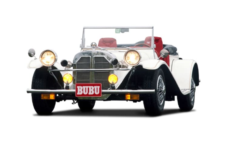 La BUBU SSK, évocation lointaine d’une Mercedes d’avant-guerre D’ailleurs, à l’origine, l’officine japonaise créée par Akio Mitsuoka n’était pas spécialisé dans la transformation de berlines classiques en « création néo-rétro ». C’est avec une sorte de voiturette sans permis à 3 roues dénommée BUBU501 et dotée d’un petit 50 cc que l’animal s’était véritablement lancé en 1982. Un Aixam nippon, en quelque sorte, qui fera son beurre avec la BUBU502 (un cube) ou la BUBU504, à 4 roues ! Oui mais voilà, rapidement, Akio San s’est dit qu’il y avait un créneau sur le marché des répliques plus ou moins fidèles, d’autant que la nouvelle législation sur les minicars condamne ses premières BUBU. Il lance alors, en 1985, la BUBU505-C, sorte de minicar singeant un roadster Mercedes sur base Volkswagen Cox. Enhardi, Mitsuoka décida de passer à la vitesse, mais surtout à la gamme supérieur, avec en 1987 une « vraie » voiture dénommée SSK, toujours ouvertement inspirée par les Mercos d’avant-guerre.