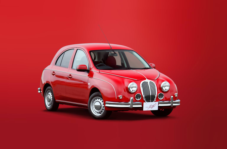 La Baroque Le Seyde, ici dans l’une de ses dernières versions Constatant le goût de ses compatriotes pour le néo-rétro, Akio Mitsuoka se décide à offrir au plus grand nombre une voiture originale et fleurant bon la nostalgie, le passé, bref, les années 60. Et quelle voiture l’incarne le plus dans un pays relativement anglophile dans ses références automobiles : la Jaguar Mk2 pardi ! D’une certaine manière, le physique rebondi de la Nissan March K11 (connue chez nous sous le nom de Micra) s’y prête particulièrement : Akio Mitsuoka va donc transformer la March en Mk2, ne conservant que la cellule centrale (reconnaissable à tous les coups) pour ne modifier que les parties avant et arrière.