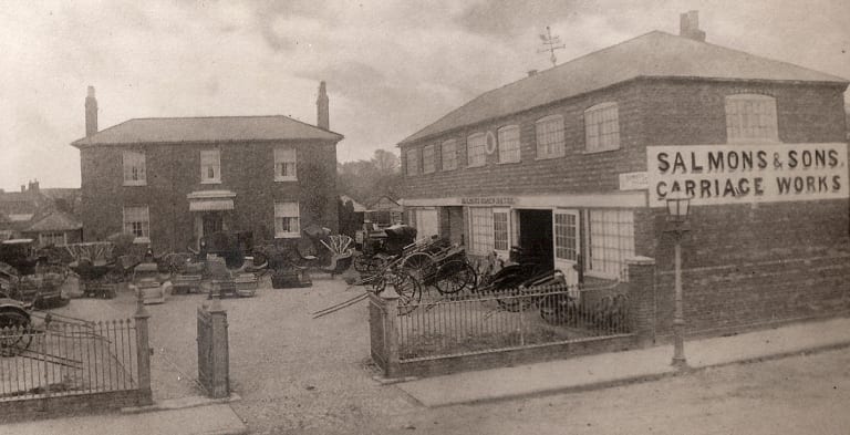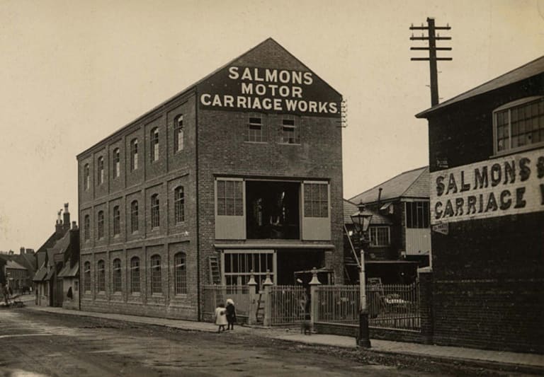 Et Newport Pagnell dans cette histoire me direz-vous ? Aston Martin ne s’y installa définitivement qu’à la fin des années 50, mais l’usine « historique » ne datait pas d’hier. En 1830, Joseph Salmons fondait dans cette petite ville son entreprise de fabrication de calèches. A l’initiative d’un client fortuné, Salmons produisit sa première automobile sur un châssis Daimler. La production en petite série d’automobiles commença sérieusement en 1900, et rapidement, Salmons devint un spécialiste de la réalisation sur mesure de carrosserie sur la base de châssis fabriqués par les constructeurs. L’activité de fabrication de calèche devint annexe, et fut délocalisée ailleurs dans la ville, tandis que les locaux d’origine situés Tickford Street, devinrent rapidement trop petits.