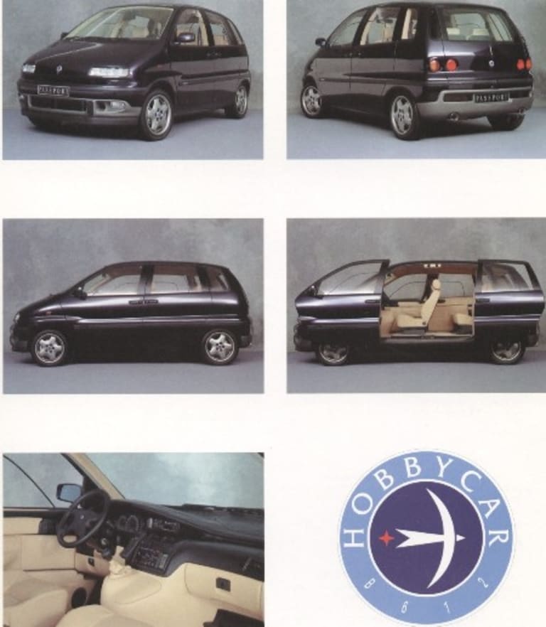 Le Hobbycar Passport est original à plus d’un titre. D’une part son traitement luxueux (intérieur cuir, téléphone et fax) désigne clairement une cible « business » ce qui tranche avec l’idée « familiale » que l’on se fait à l’époque du monospace. D’autre part, ses caractéristiques techniques la classe d’emblée parmi les sportives, avec son 2 litres turbo d’origine Opel développant 204 ch et permettant d’accrocher les 220 km/h, sa boîte 6 vitesses et surtout sa transmission intégrale (le moteur comme la transmission venaient de l’Opel Calibra 4×4). Enfin, son système original de portes coulissantes sans montant central permettait d’accéder facilement à toutes les places. Son prix : 280 000 F HT à l’époque.