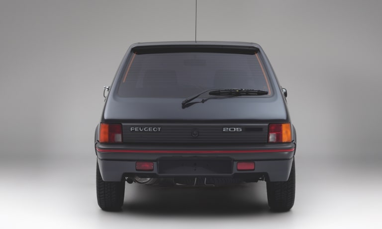 Cette 205 blindée se différencie peu extérieurement d’une GTi standard (en version 1.9 litres et 130 chevaux). En effet, malgré une prise de poids conséquente (environ 500 kg), les suspensions revues lui laissent une hauteur de caisse absolument normale. Les plus avertis remarqueront les plaques de custode non logotées (l’une d’entre elles servant de support à l’antenne du téléphone), ni même l’arrière, la vitre supplémentaire derrière le hayon ou encore le montant de pare-brise un peu plus épais.