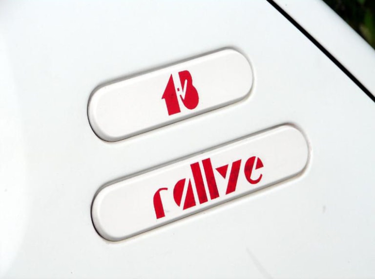 Contrairement à la GTI, la Rallye n’a rien à faire dans les beaux quartiers. Son équipement est d’ailleurs réduit au minimum : du sport, rien que du sport. Le dépouillement est donc de rigueur, avec une finition plus proche du bas de gamme Junior que de la Gentry (lire aussi: Peugeot 205 Gentry). Mais cette absence d’équipements permet à la Rallye d’afficher le poids plume de 790 kg. Extérieurement, pas de jantes en alliage, mais de simples jantes en tôle peintes en blanc, et de légers élargisseurs d’ailes lui donnent la touche sportive qui la distingue de la gamme civilisée des 205. Un autre détail qui a son importance rappelle qu’on a à faire à une vraie sportive : les 4 bandes rouge/bleu marine/jaune/bleu clair de Peugeot-Talbot Sport (PTS pour les intimes).
