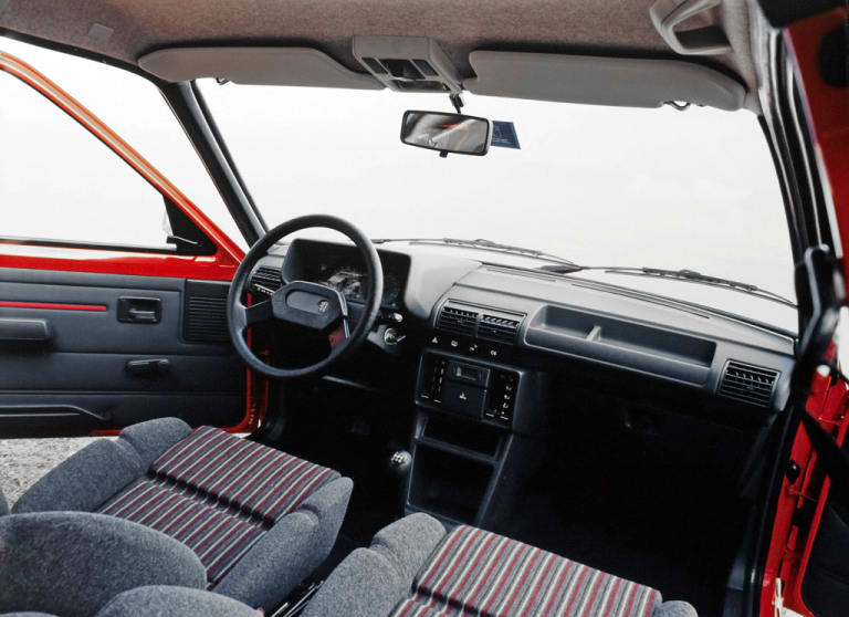 La recette ? Un châssis et un train avant moins évolués que la GTI, mais un petit moteur bien connu des “sportifs” tatoués du lion : le moteur X de 1 360 cc et 80 chevaux déjà présent sous le capot de l’amusante 104 ZS donc. Pour la décoration, un pare-choc spécifique, des décorations “XS” du plus bel effet, un volant de GTI et un intérieur inspiré par cette dernière, des jantes en tôle de 13 pouces mais dont l’allure reste dynamique, et divers petits détails insignifiants (un compte-tours par exemple), mais qui distinguent la petite lionne du reste de la gamme et donnent cette impression de puissance qu’elle n’a pas forcément avec son petit X rageur, ses 80 équidés et ses 820 kg seulement.